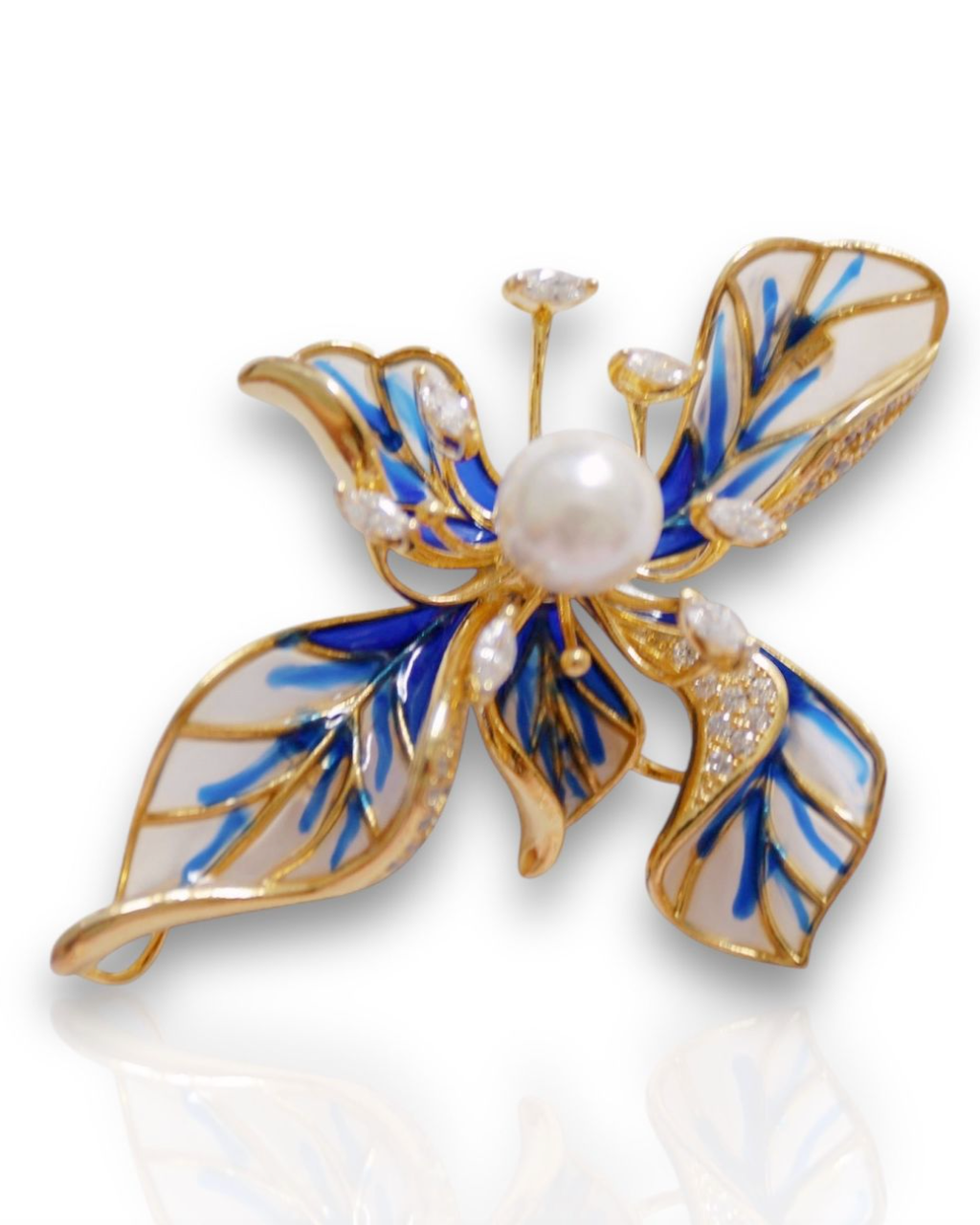 A freshwater pearl sits in the middle of this eye-catching brooch that’s been formed to look like an iris flower.